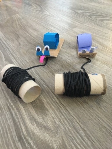 Z proužku papíru si vytvoříme ulitu a tykadla a přilepíme na tělíčko (proužek kartonu).