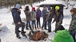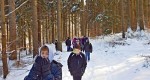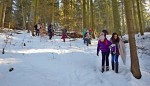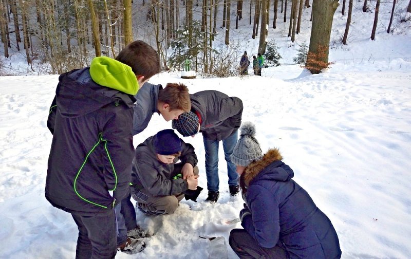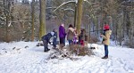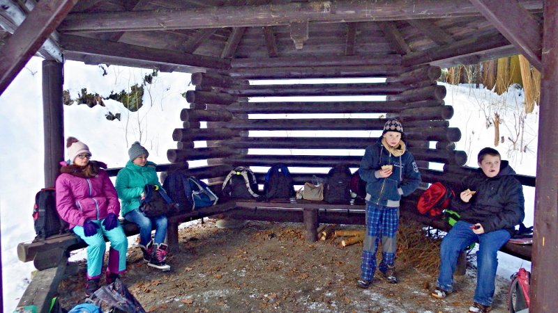 Od zámku jsme po zeleném turistickém značení došli k vojenské škole. To už vysvitlo slunce a výrazně se oteplilo. Díky svozu dřeva byla projeta cesta, a tak jsme se nemuseli brodit sněhem. Po malých skupinkách jsme postupně prošli Čertovou roklí (Peklo) ke studánce a altánu. Kluci z 8. třídy pomohli připravit ohniště, takže se všichni mohli ohřát a kdo chtěl, opekl si buřta.