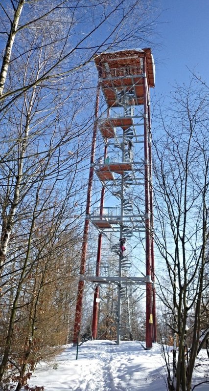 U rozhledny část žáků luštila vzkazy v morseovce a další část stoupala po schodech na rozhlednu. Pod nimi ležela promrzlá Moravská Třebová.